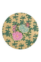 East meets West in this golden fusion: a Tibetan geometric motif intertwines with Lisa Corti’s signature Queen flower, creating a rich tapestry of tradition and contemporary flair.