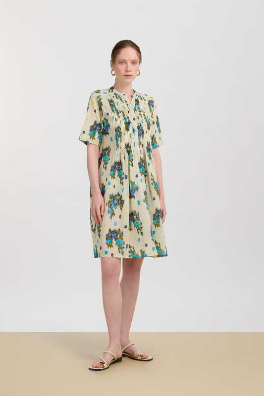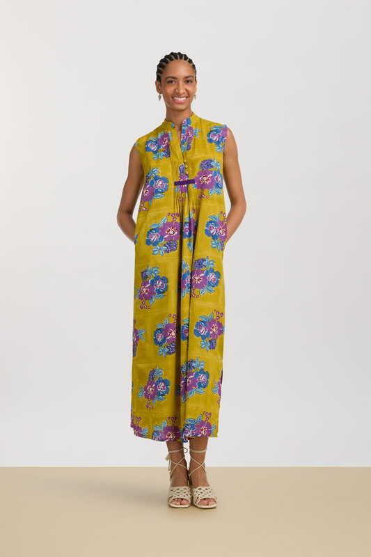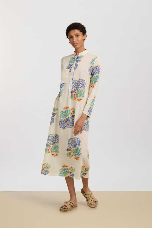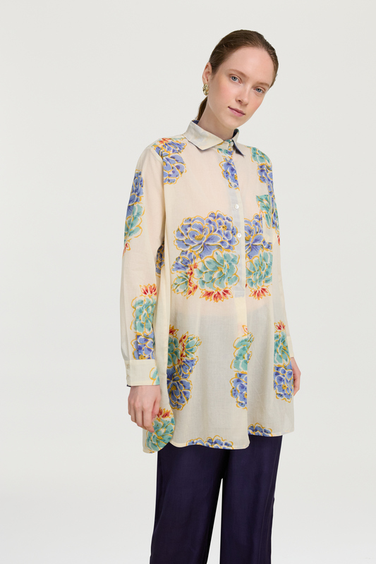 Lisa Corti's Kandem White Flower design draws inspiration from a Tibetan floral motif merged with the intricate peony and botanical butterfly. The design features an enhanced flower that transforms into a geometrical pattern through handcrafted screen printing. The signature stripey border creates a frame for the encased floral display, with warm-hued colours of yellow, orange, and pinky dusky reds adding a new layer of depth to the deep sea greens and sky blues. Each piece within the collection is uniquely laid out to follow the size of the design.