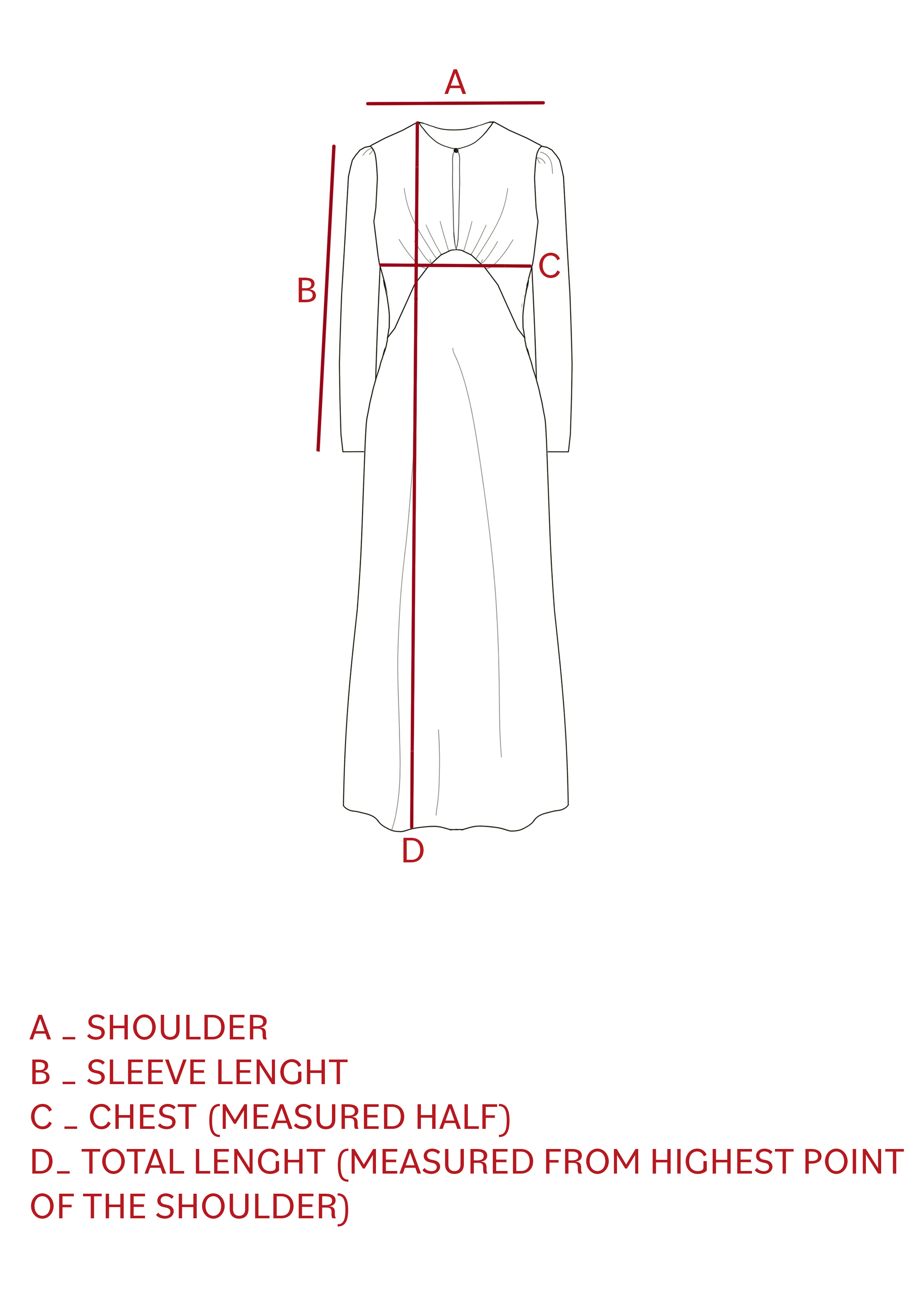 Cut from fluid viscose crepe. The Nika Dress blends romantic detail with everyday versatility. The rounded empire waistline creates a softly feminine silhouette, while the full-length drape and long sleeves lend an elegant, elongating effect. Finished with subtle gathers and graceful movement, it is a seasonless piece designed to carry effortlessly from day to evening.