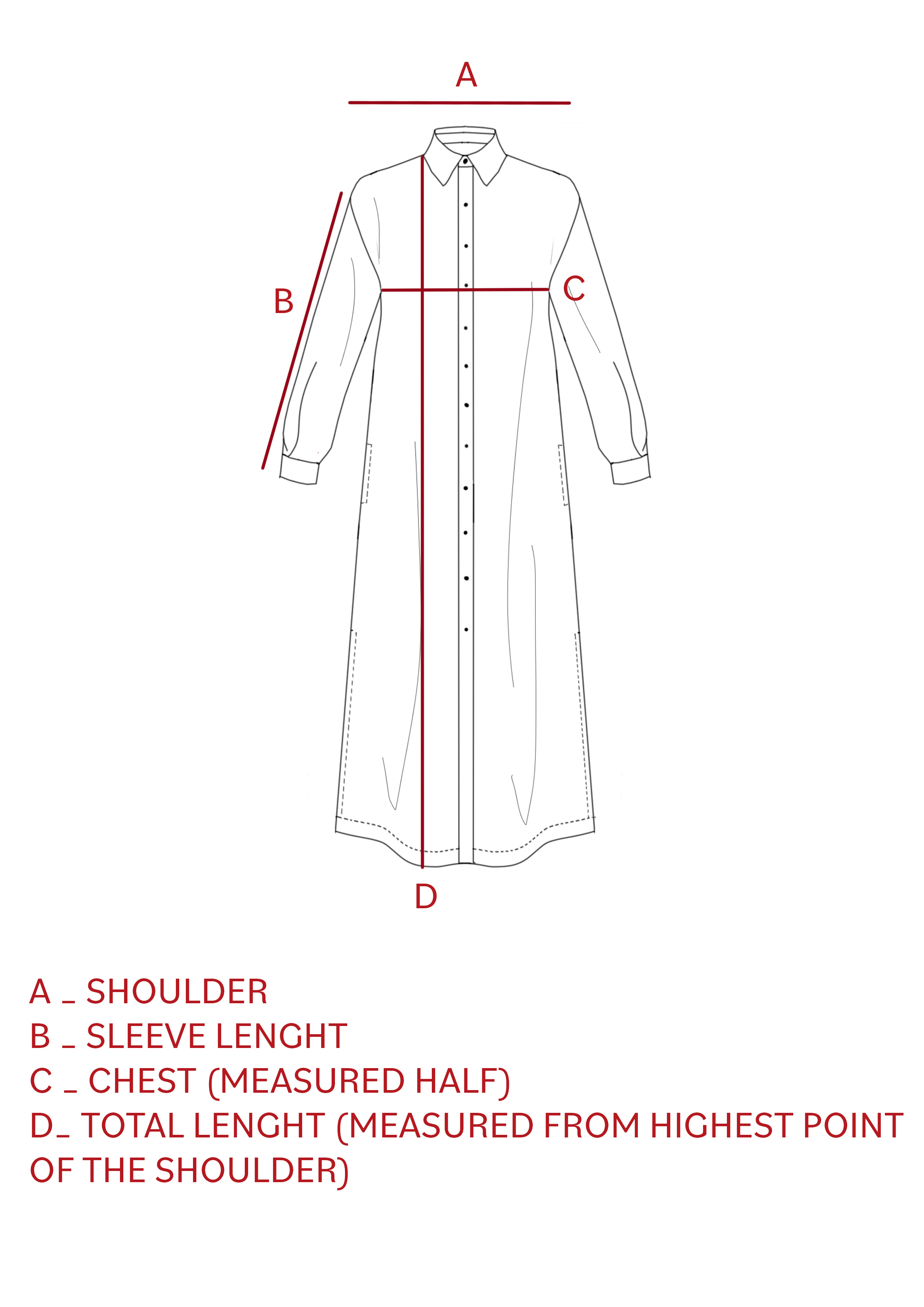 The Odette Dress is crafted in India from lightly transparent cotton sally with a subtle check. Cut with a shirt collar, button front and cuffed sleeves, it showcases the hand screen printed Naoshima chrysanthemum.