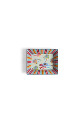 The Jungle Parrot design was born of a journey to Cambodia, in particular to the ruins of Angkor Wat, where architecture, vegetation, and vibrancy coexist. Painted originally in watercolour, the scene unfolds like a miniature tableau at the centre of each plate. The storybook composition, anchored by a distinct striped rim rendered in five colourways, offers a modern counterpoint, a signature of Lisa Corti.