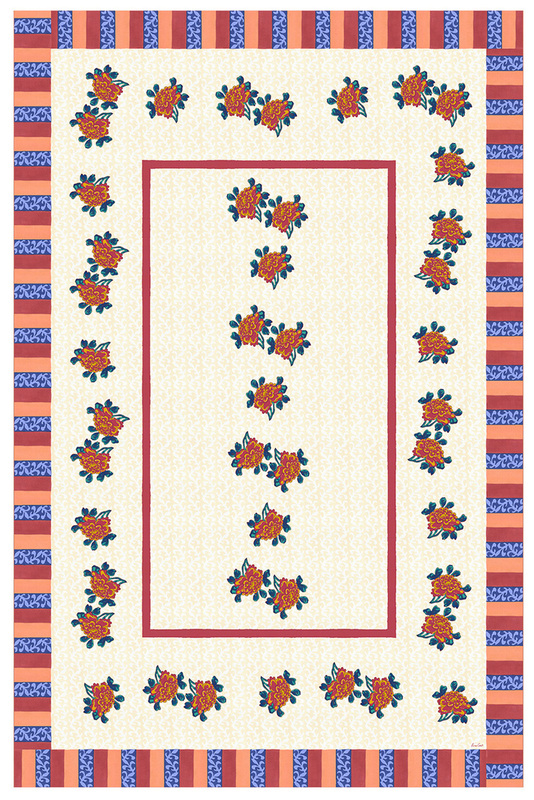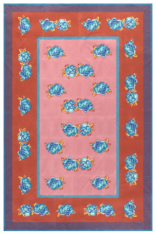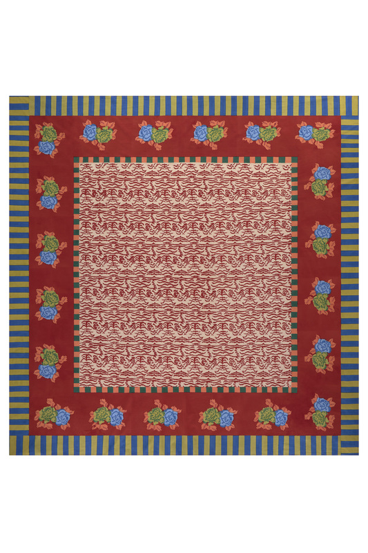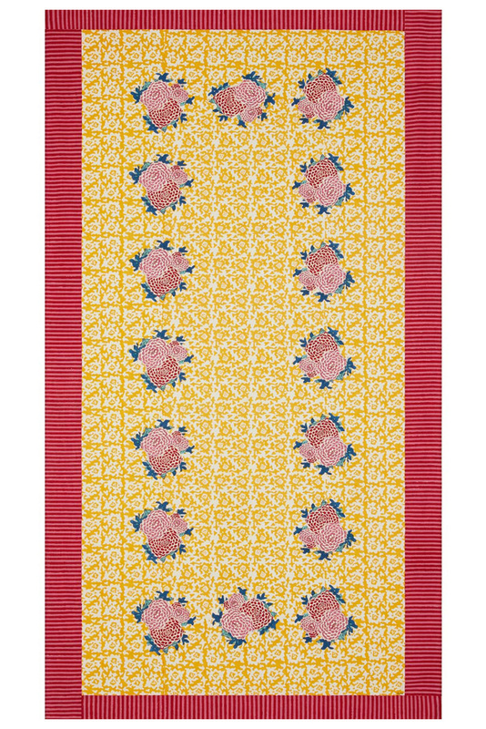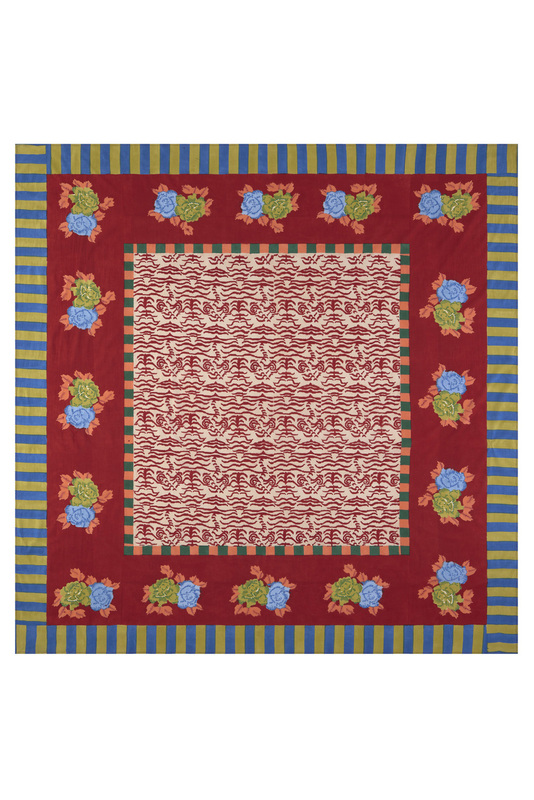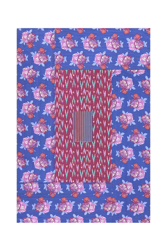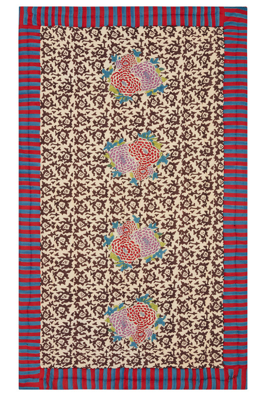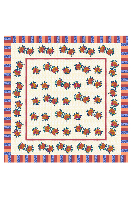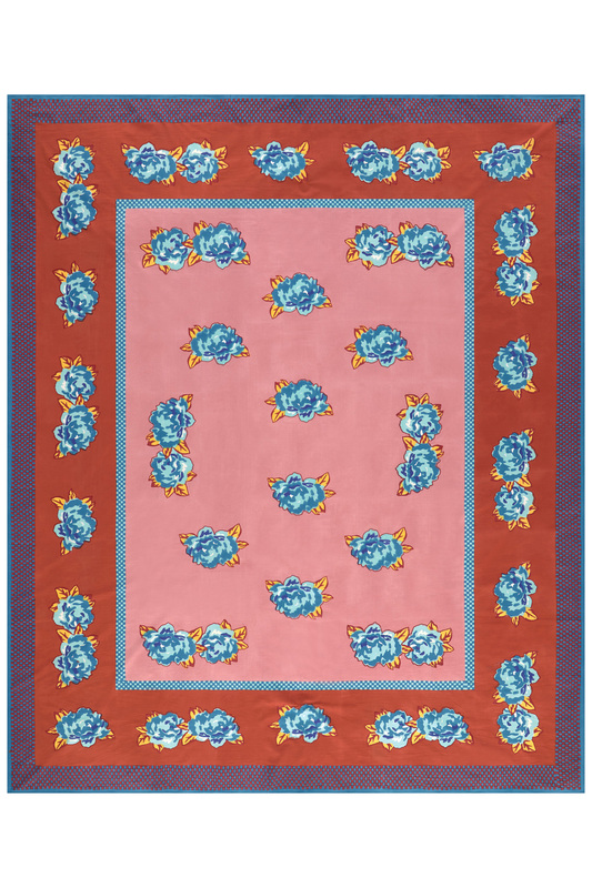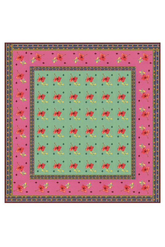 Stampa dipinta a mano in India con la tecnica a blocchi. Protagonista è un fiore Ibisco, ispirato da un antico erbario reinterpretato in chiave attuale grazie a un serrato ritmo di disposizione. Particolare è il doppio bordo che rappresenta in forma stilizzata una tradizionale tecnica di cucitura indiana, il Kantha, che utilizza scampoli di cucitura per confezionare ricercate decorazioni.
