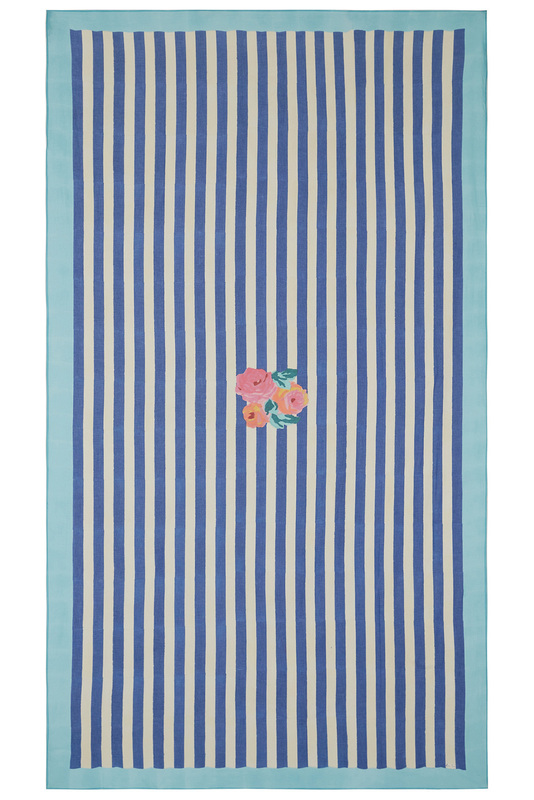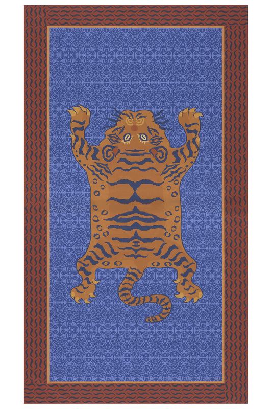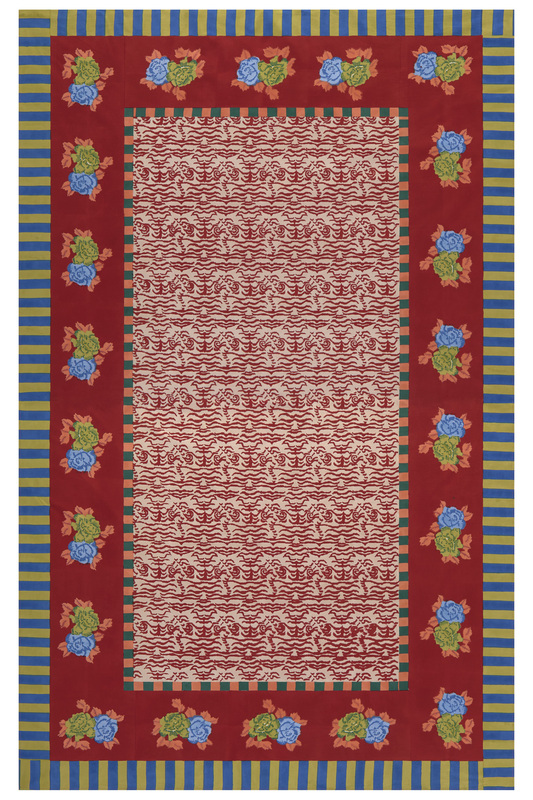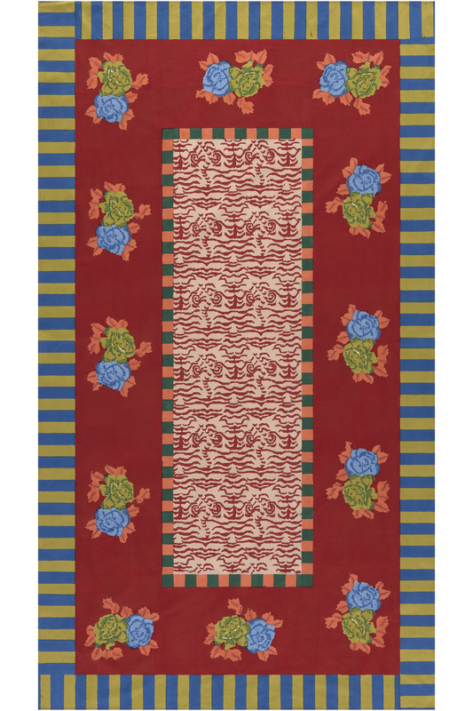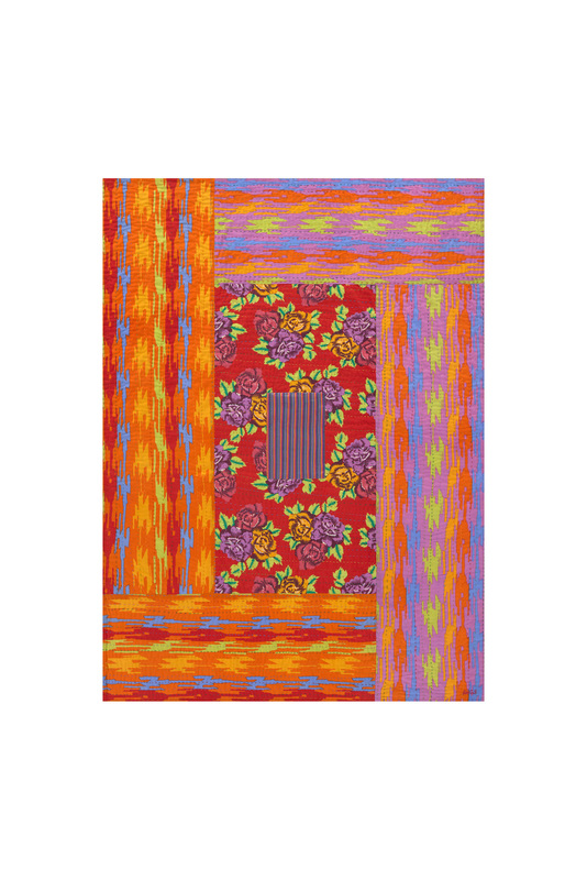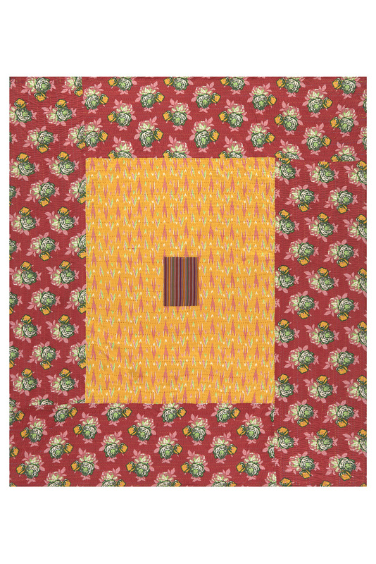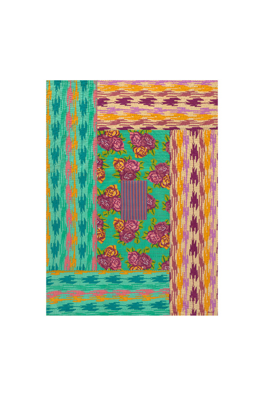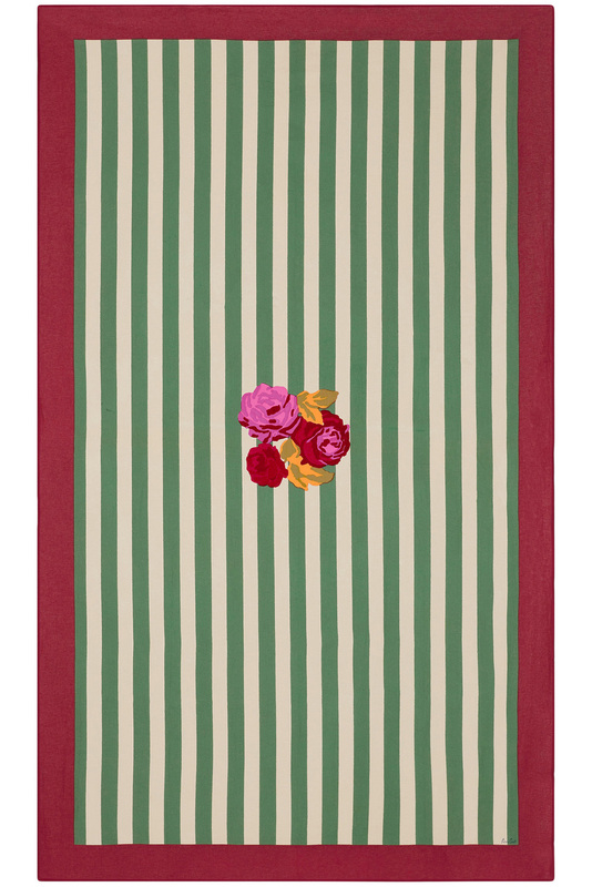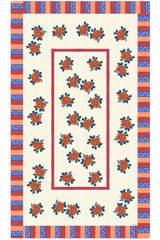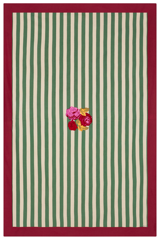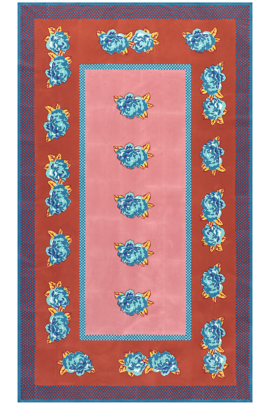 Stampa dipinta a mano in India con la tecnica a blocchi. Protagonista è un fiore Ibisco, ispirato da un antico erbario reinterpretato in chiave attuale grazie a un serrato ritmo di disposizione. Particolare è il doppio bordo che rappresenta in forma stilizzata una tradizionale tecnica di cucitura indiana, il Kantha, che utilizza scampoli di cucitura per confezionare ricercate decorazioni.