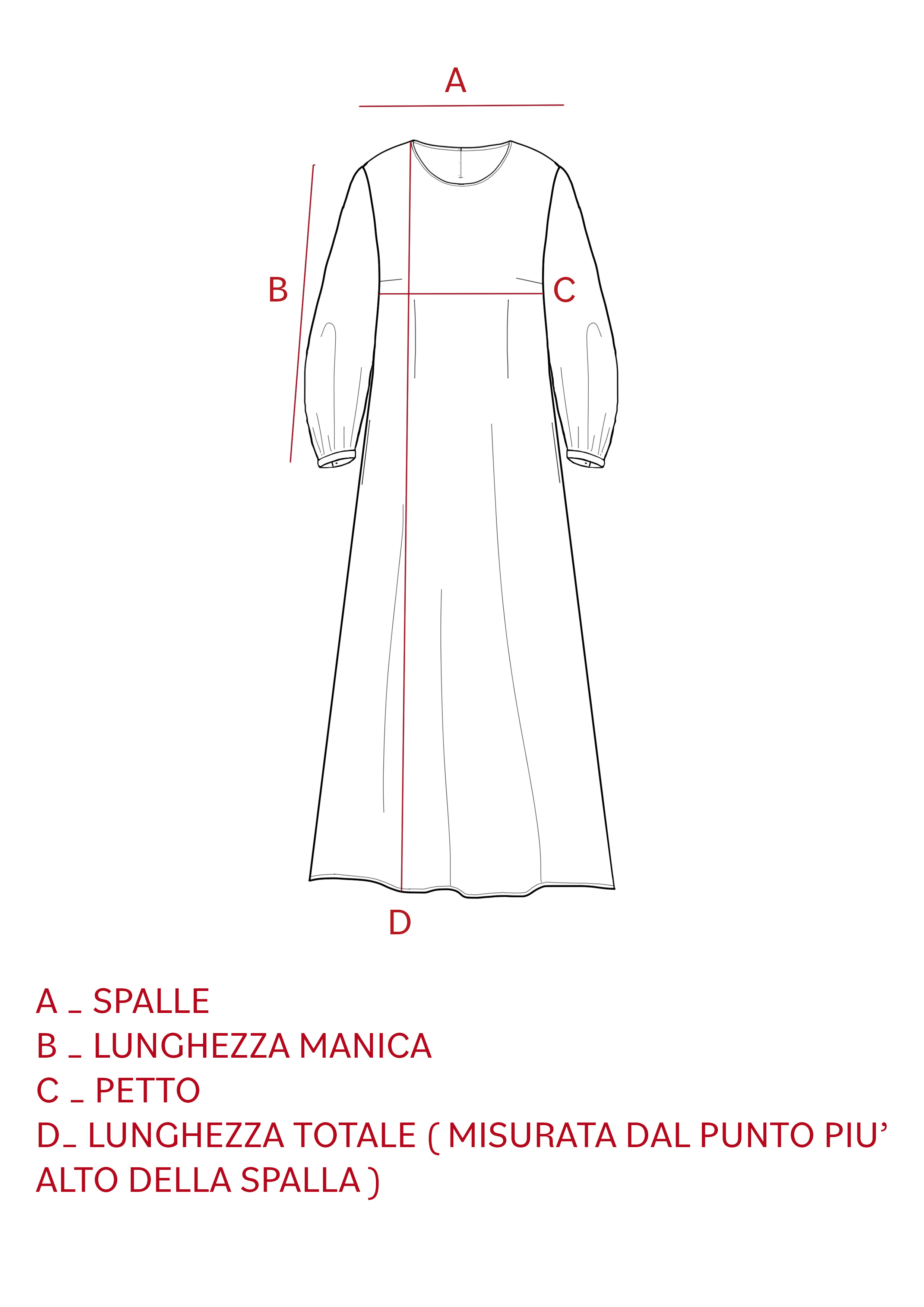 Abito lungo a girocollo realizzato in viscosa che oltre ad essere fresca e leggera al tatto è rifinita con un sofisticato effetto crêpe. Le maniche, lunghe e voluminose, si stringono sui polsini.
