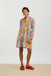 La stampa ha come protagonista un grande mazzo di Dalie stilizzate e ispirate alla pittura impressionista. Un fiore iconico dell'archivio Lisa Corti dipinto a mano in India con la tecnica a blocchi e che qui è valorizzato in tutta la sua bellezza da un intenso sfondo in tinta unita.