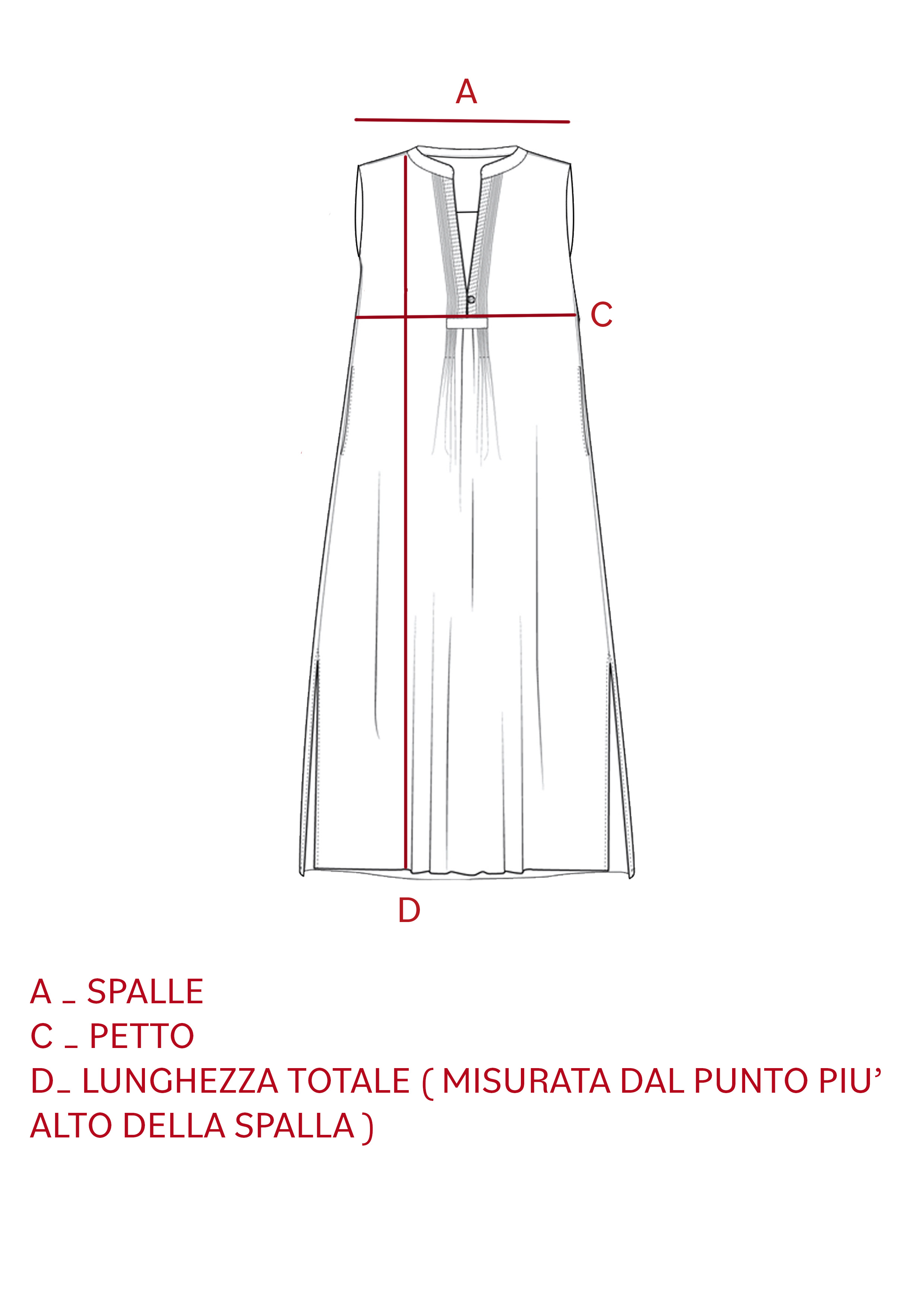 Nuovo modello di caftano senza maniche per uno stile elegante e disinvolto. Realizzato in 100% cotone, ha uno scollo profondo valorizzato da una leggera plissettatura e da una fascetta di rifinitura a contrasto. Due spacchi laterali garantiscono una vestibilità comoda e agevole.