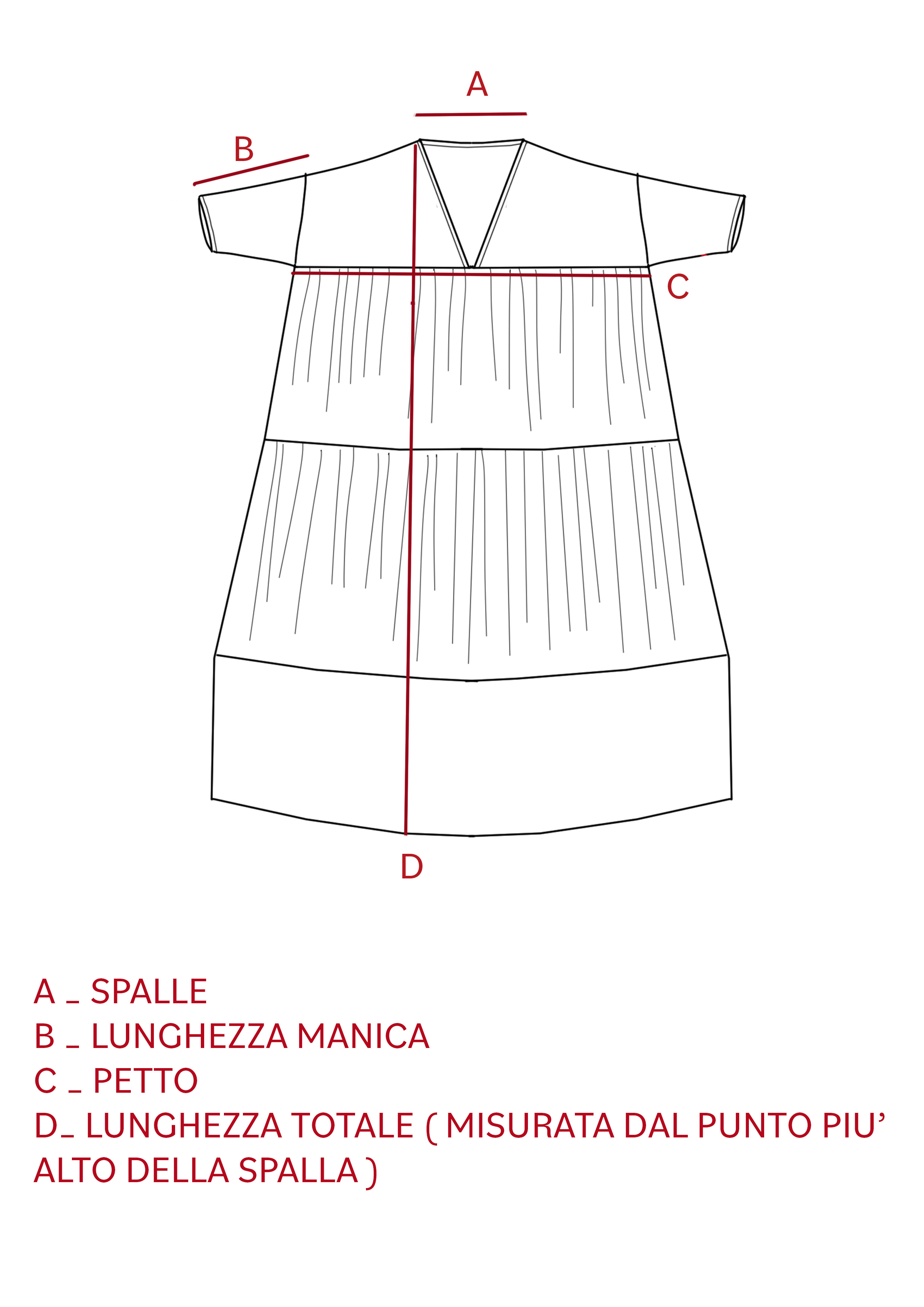 Un caftano lungo e ampio, realizzato con sette metri di leggerissima e impalpabile viscosa che crea tre grandi balze con arricciatura. Anche le maniche hanno un taglio morbido valorizzato da un bordo elasticizzato. Ha inoltre una vestibilità double face: può essere indossato infatti sia dalla parte dello scollo a V che del girocollo.