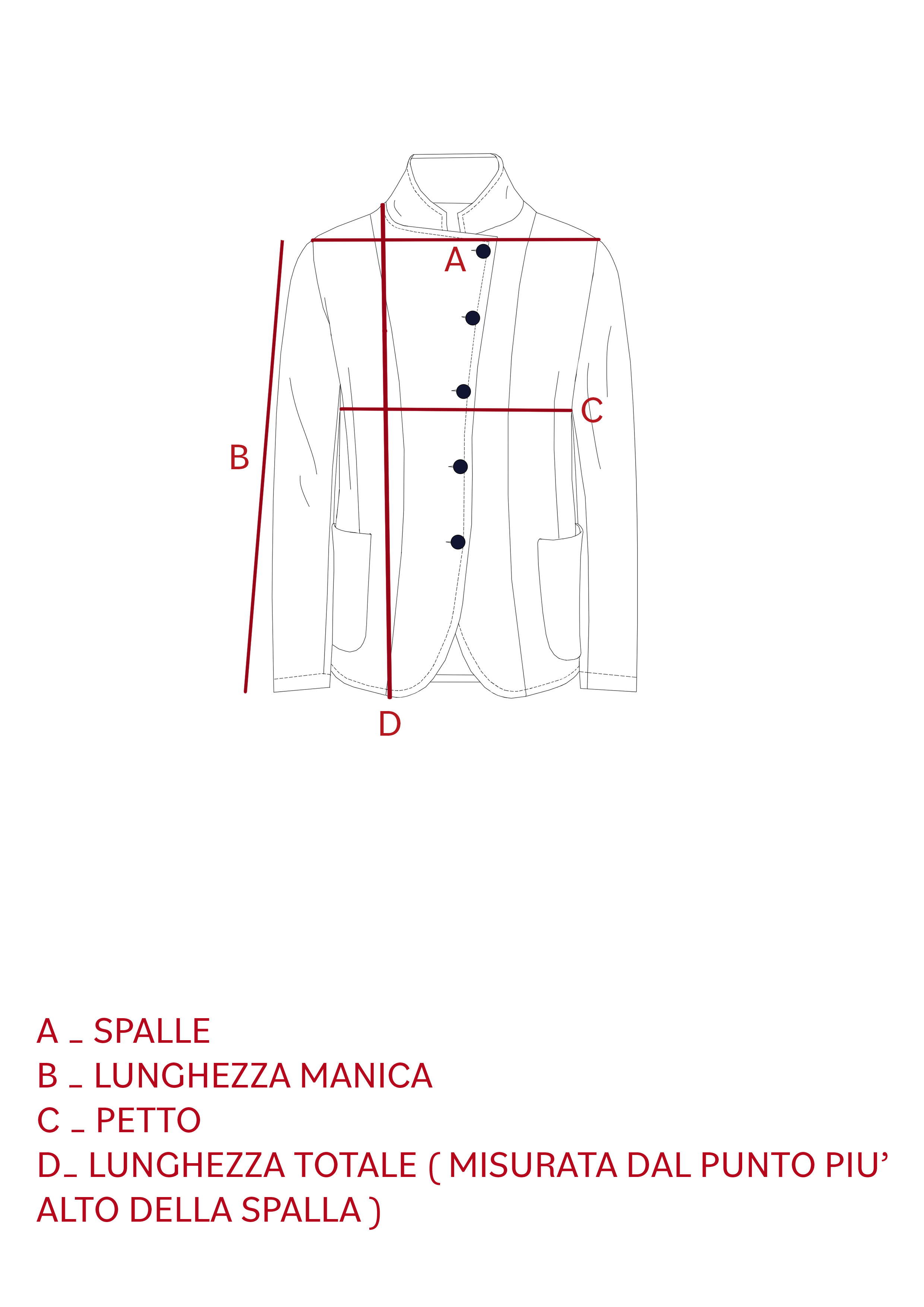 Giacca sartoriale in lana dall'intramontabile taglio maschile. Realizzata in Italia, ha la particolarità del colletto guru d'ispirazione orientale, oltre ad un'inaspettata abbottonatura asimmetrica e una fodera interna a contrasto.