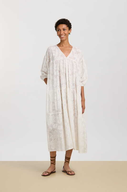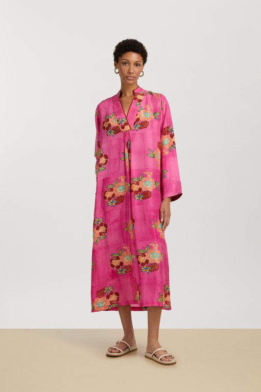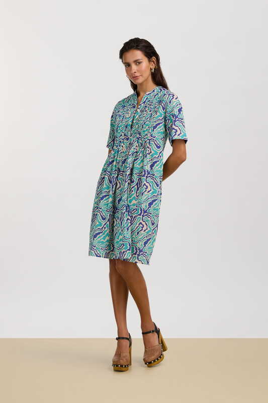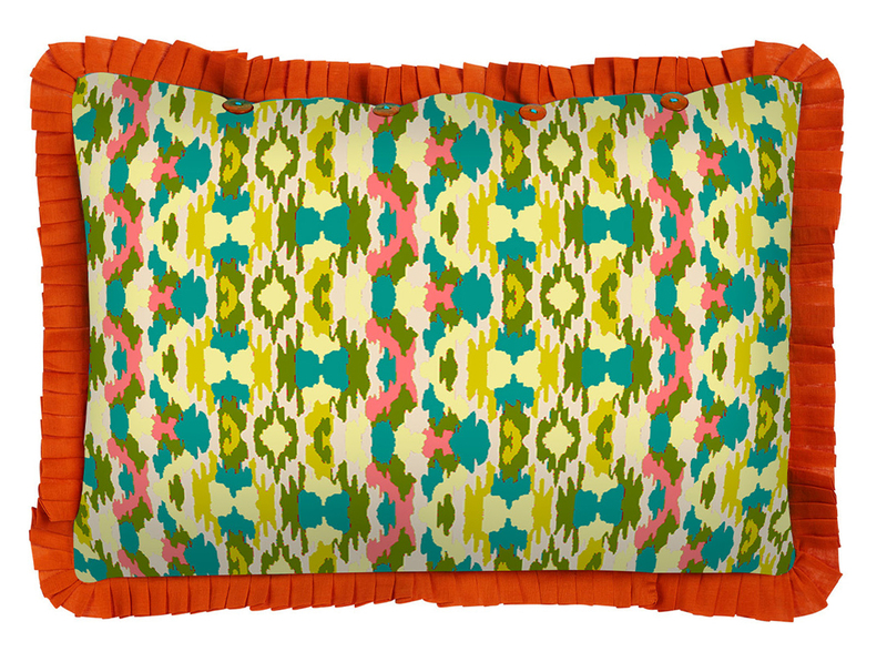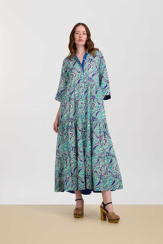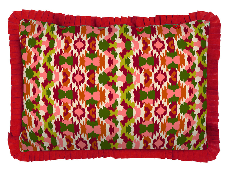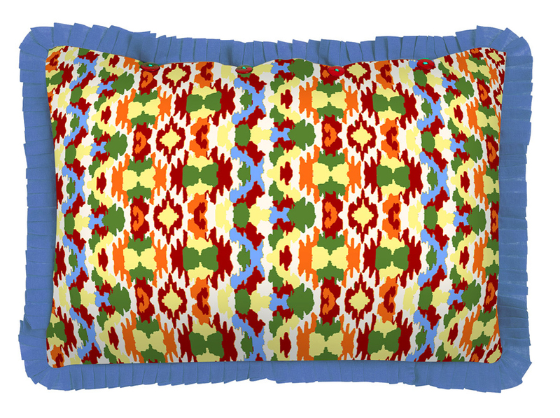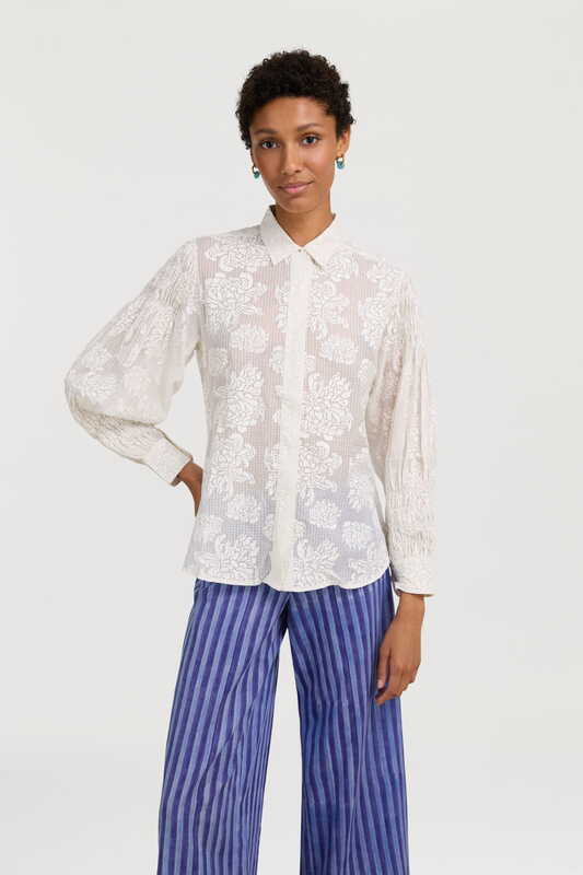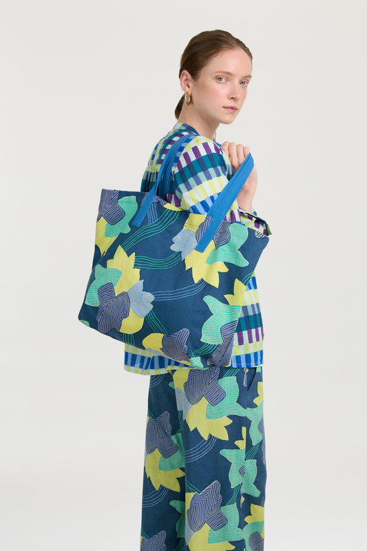 Una stampa che intreccia l’Europa continentale di fin de siècle con la più classica tradizione nipponica. La trama, accesa da un blue pervinca di cui ricorda la flessibilità e l’intreccio, richiama l’arte dell’impagliatura viennese, mentre i fiori sbocciati su foglie verdi evocano il disegno di un antico kimono scoperto su un prezioso libro d’arte. Le iconiche stripes chiudono il perimetro della stampa richiamando il colore dei petali e delle lamine vegetali. Il disegno, come da tradizione Lisa Corti, è realizzato a mano in India con l’antica tecnica del block print.