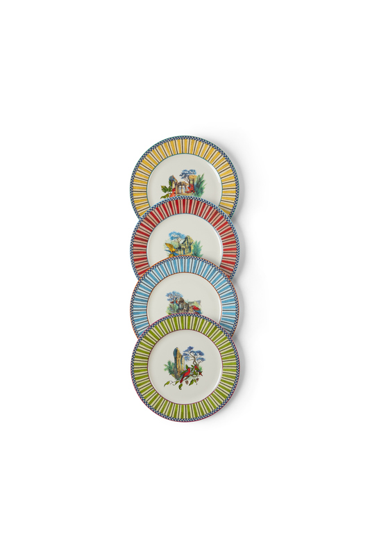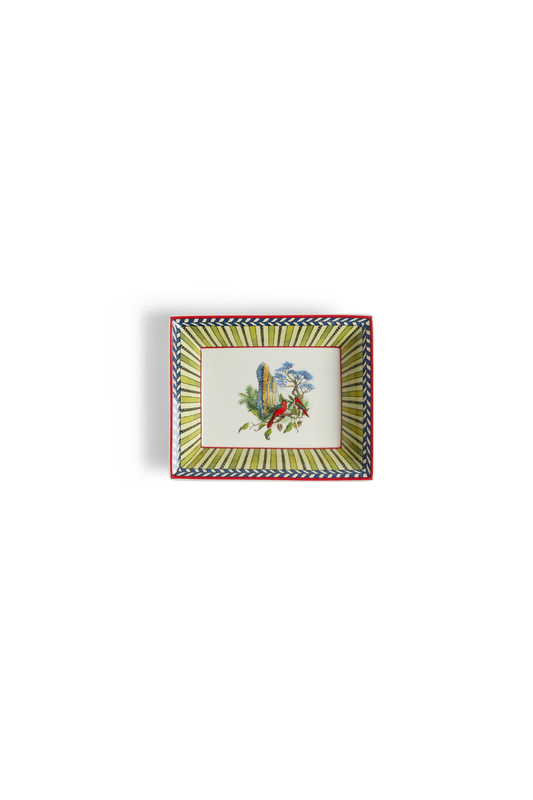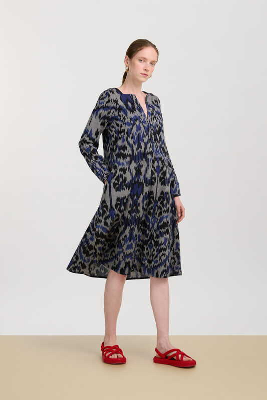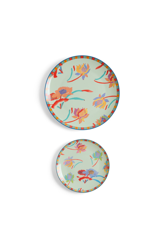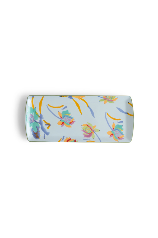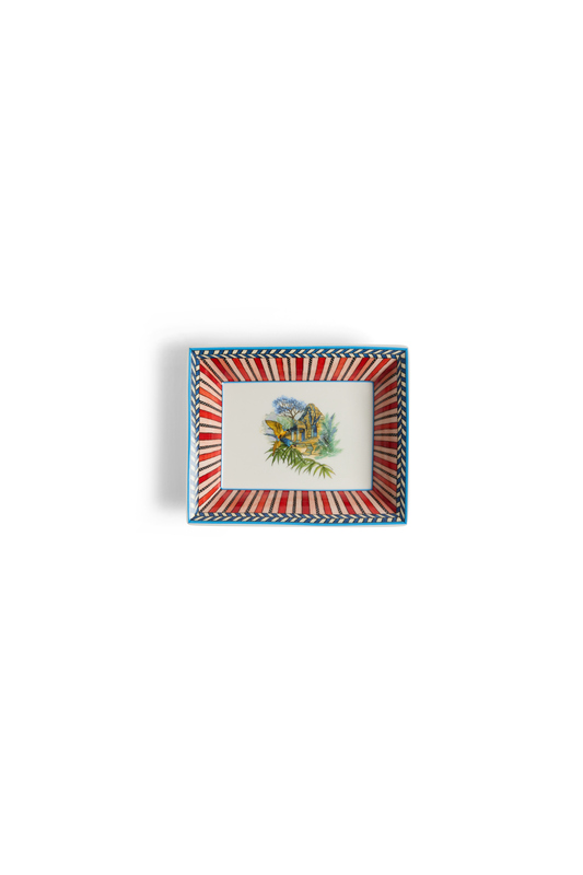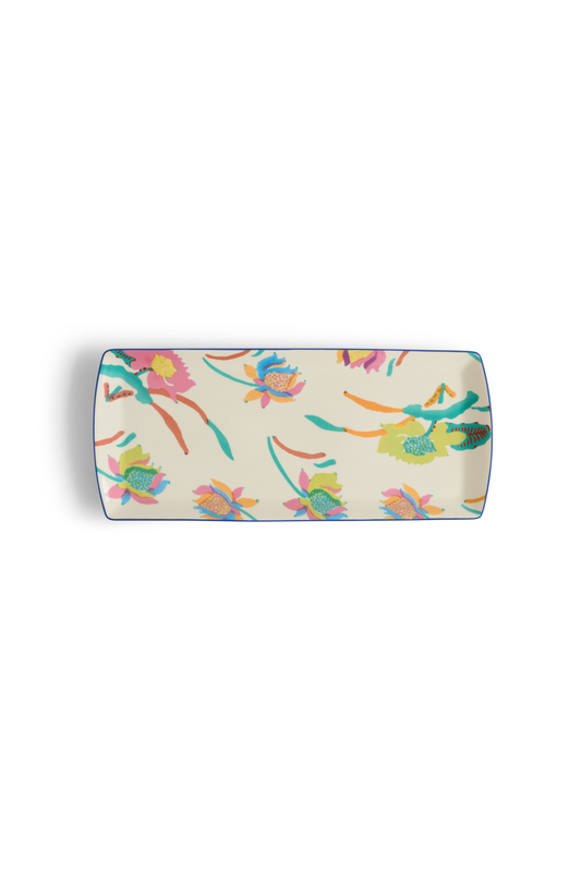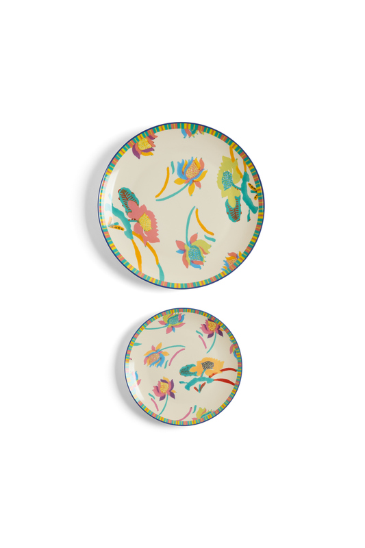 Questa stampa nasce dalla combinazione tra un pattern geometrico ispirato ad un motivo tibetano e l'iconico Queen Flower che è un classico dello stile Lisa Corti. Realizzata artigianalmente con la tecnica screen printed in un acceso blu oltremare, è incorniciata da un motivo a stripes in toni aranciati che riprende il caldo colore dei petali.